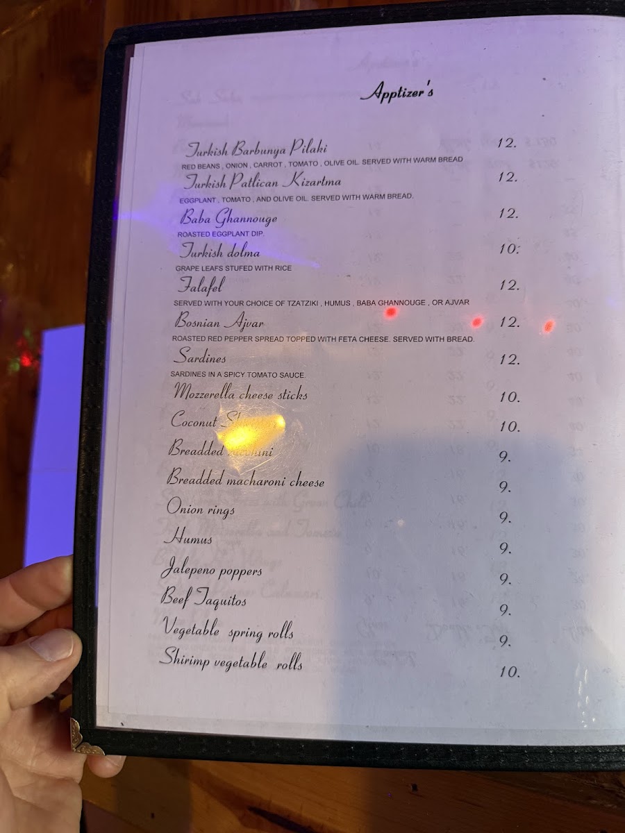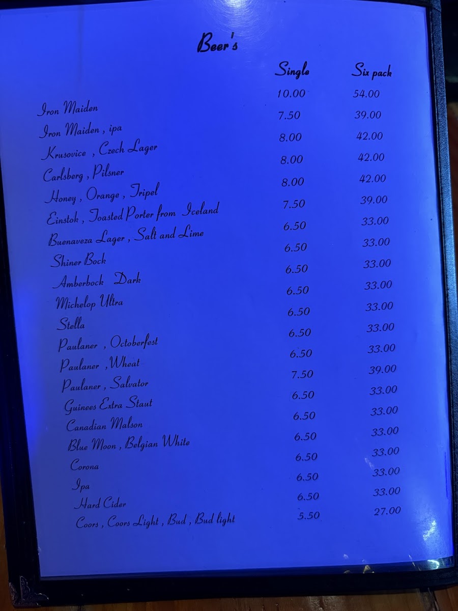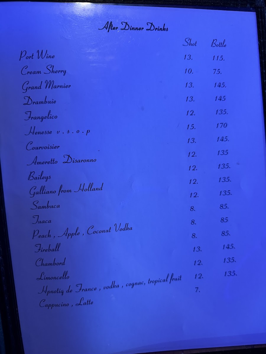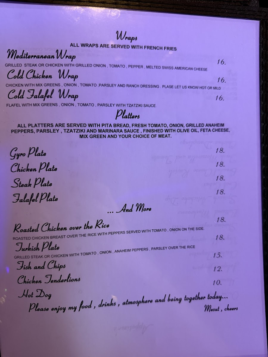 Beverage choices include a range of cocktails such as margaritas, rum & coke, gin & tonic, whiskey-based drinks, Long Island iced tea, and specialty options like Bailey's & coffee and Turkish Raki. Well drinks and premium spirits such as Grey Goose and Glenmorangie are also available.