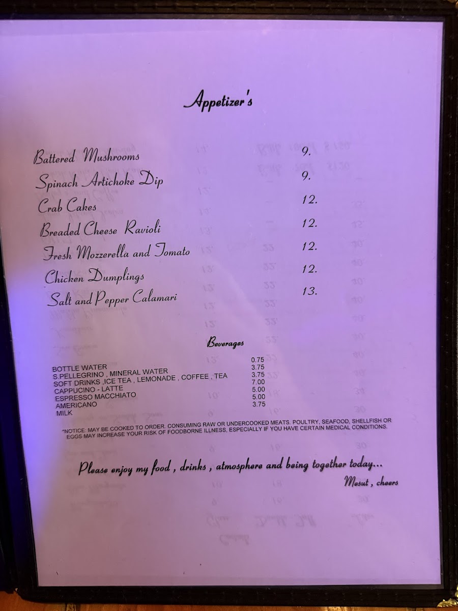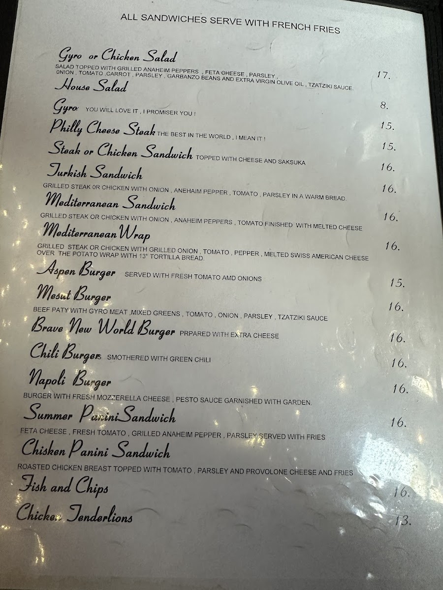 For lunch and casual meals, the menu features sandwiches like the Philly Cheese Steak and gyro, as well as salads and appetizers including breaded cheese ravioli and cheeseburger sliders. The presence of items like fish and chips and gyro salad further broadens the food offerings.